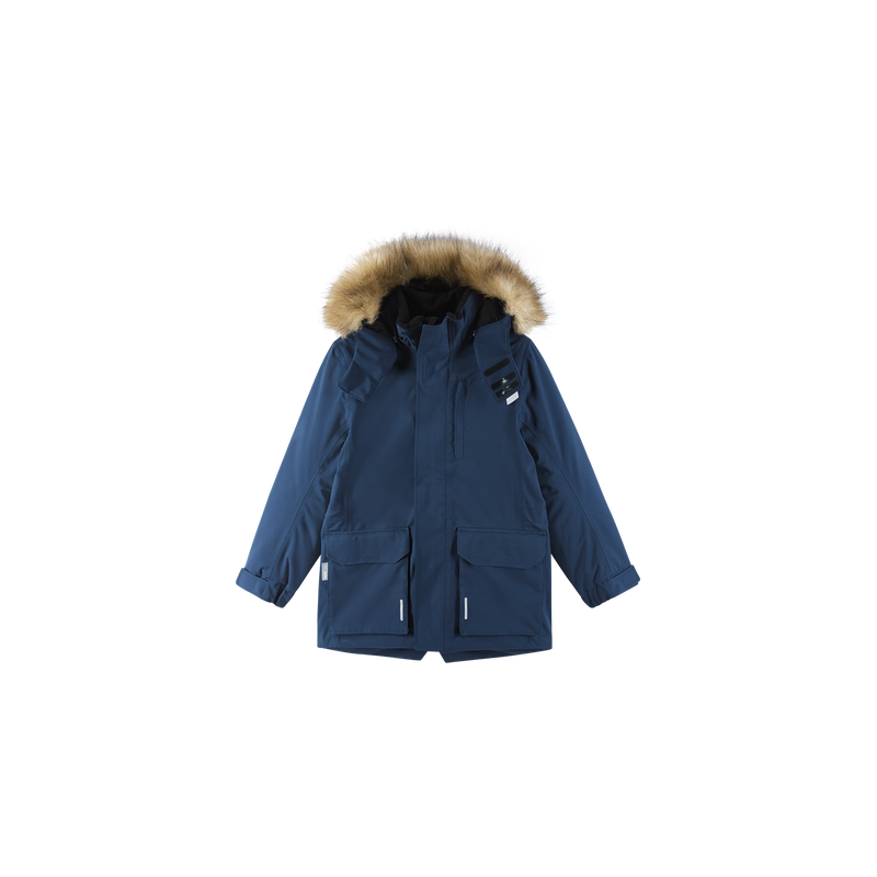 A classic, long-lasting waterproof winter coat for kids. This insulated jacket comes with handy details and lots of recycled fibers. The name, Ajaton, is Finnish for 'timeless'. Old Naapuri renewed. Meet the Ajaton kids' waterproof winter jacket, expertly crafted for your little adventurer. Boasting full waterproofing with all seams taped, this jacket keeps the chill at bay while ensuring your child remains dry and comfortable. The durable material breathes well and is resistant to water and dirt, making clean-up a breeze. The 100% recycled insulation offers convenient warmth. For added comfort, the jacket features an adjustable waist, cuffs and a safe, detachable hood with faux fur trim. Plus, it comes with two handy flap pockets and a zipped chest pocket for their little treasures. While the reflective details can help make kids more visible in the dark, it's a bright idea to hang a reflector in the loop that's hidden under the right-hand side front pocket flap!