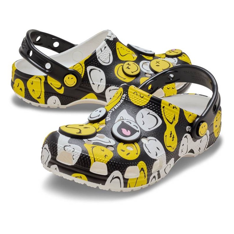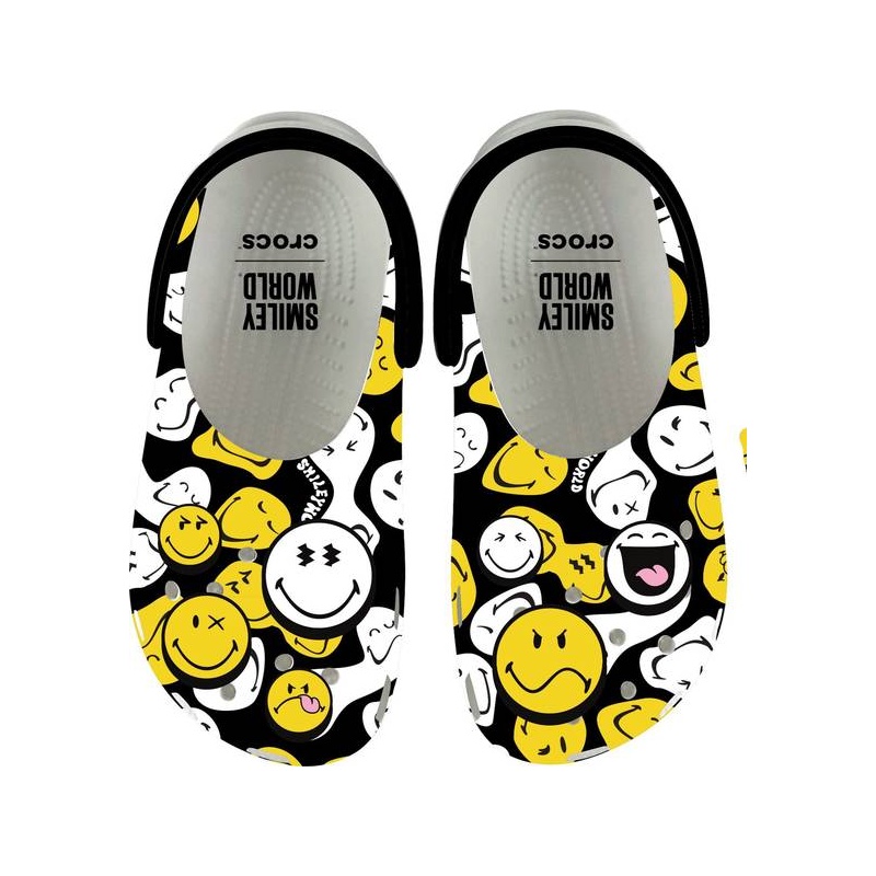 Lase väikestel kanda oma rõõmu kõikjal, kuhu nad lähevad, SmileyWorld® Classic Clogidega — mänguline paar, mis paneb naeratama kõrvuni. Mugav Croslite™ tald toetab pealist, mis on kaetud täiskattega SmileyWorld graafikaga ja juba kaunistatud lõbusa Jibbitz™ kaunistuste kollektsiooniga. Igal jalatsil on ruumi ka täiendavaks isikupärastamiseks. Rohkem naeratusi stiiliga, mis kindlasti saab nende uueks lemmikuks!
